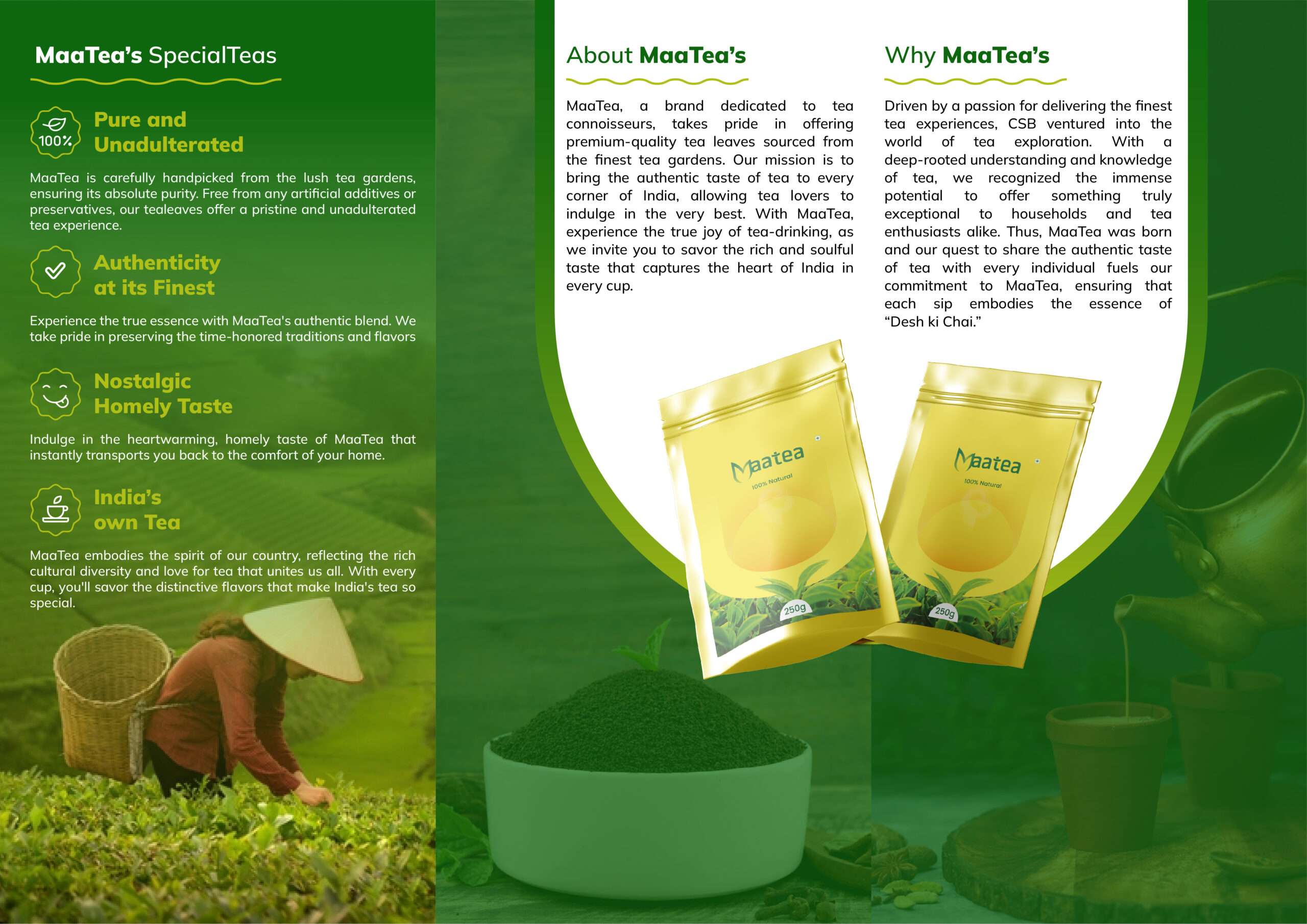 A brand dedicated to tea connoisseurs takes pride in offering premium-quality tea leaves sourced from the finest tea gardens. MaaTea was born in a quest to share the authentic taste of tea with every individual, ensuring that each sip embodies the essence of “Desh ki Chai.”